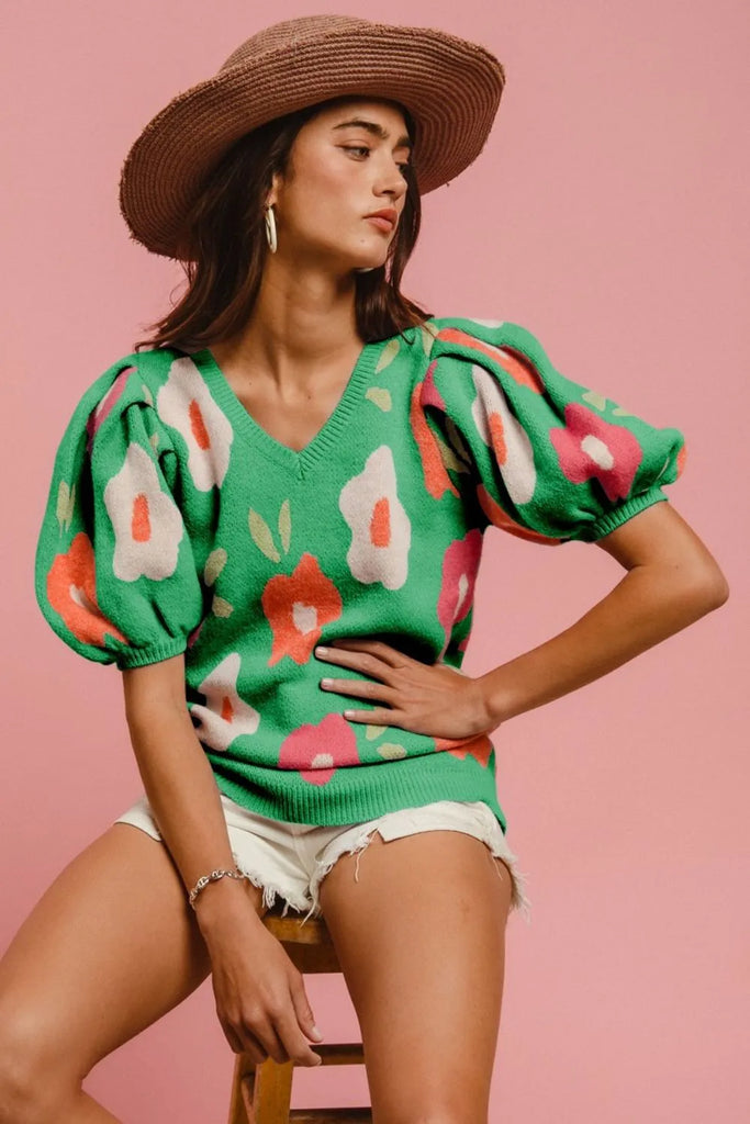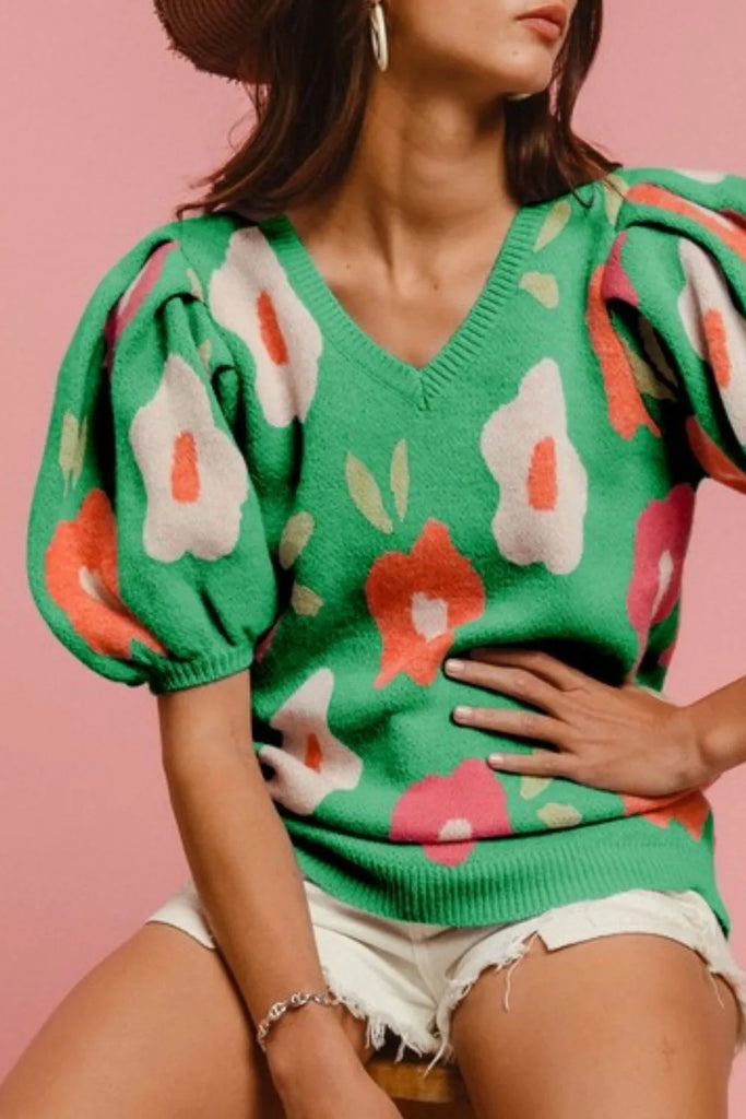 BiBi Floral Pattern Puff Sleeves V-neck Sweater